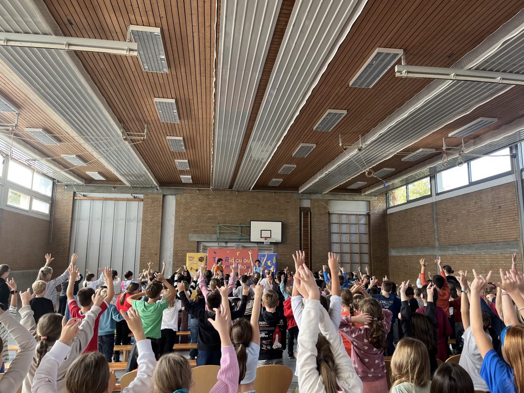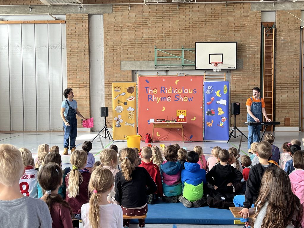 Zuerst erlebten die Klassen 1 und 2 eine 55-minütige Show mit Schauspiel, Musik und Tanz und danach die Klassen 3 und 4 genauso. Die Kinder lachten viel, fanden zusammen mit den Schauspielern Josh und Tommy englische Reimpaare, sangen englische Lieder sofort mit, tanzten mit ihnen und waren hin und weg von dem englischsprachigen Theaterstück mit all seinem Witz, seinen Überraschungen und seiner Action.